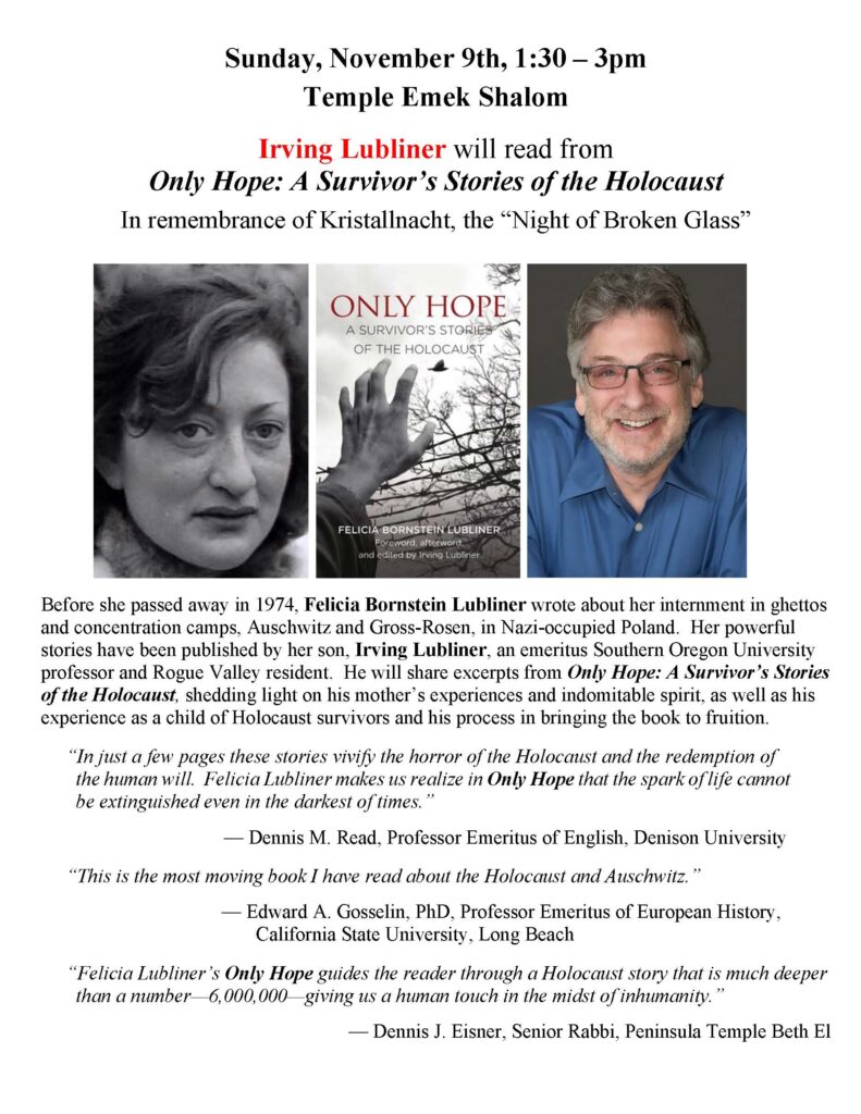 In honor of the anniversary of Kristallnacht, the Night of Broken Glass, we invite you to join us on Sunday November 9th for a special program with community member Irving Lubliner. He will share from Only Hope: A Survivor’s Stories of the Holocaust, the writings of his mother, Felicia Bornstein Lubliner, who survived the concentration camps Auschwitz and Gross-Rosen during World War II. Please see the flyer below for details—we hope you will be part of this meaningful program.